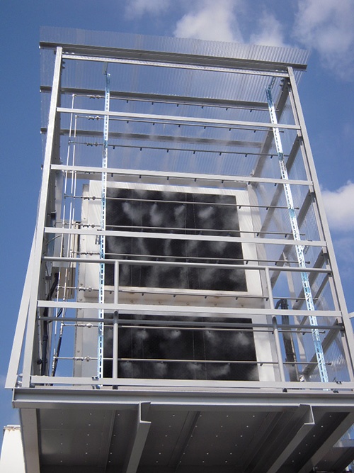 Ikeuchi’s cooling solution consists of a wall of spray nozzles which produce a semi-fine dry fog. These uniformly-sized droplets are so small  (10 to 30μm) that they will instantly evaporate upon spraying, effectively cooling the inlet air.