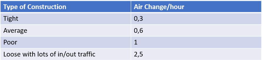 All you have left to do is to calculate the ventilation rate V by multiplying the volume of your room by the change of air per hour. Moreover, here is an indication of the air change per hour depending on your room’s construction.