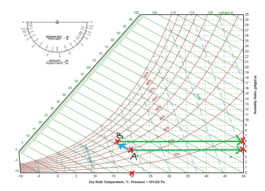 Let’s say that you want to reach 50%RH. Find the previous crossed point. Then follow the green enthalpy line upward to the 50%RH. Report the second crossing point(B) to the y-axis. In this case, the value is 6 grams of water per kilogram of air.