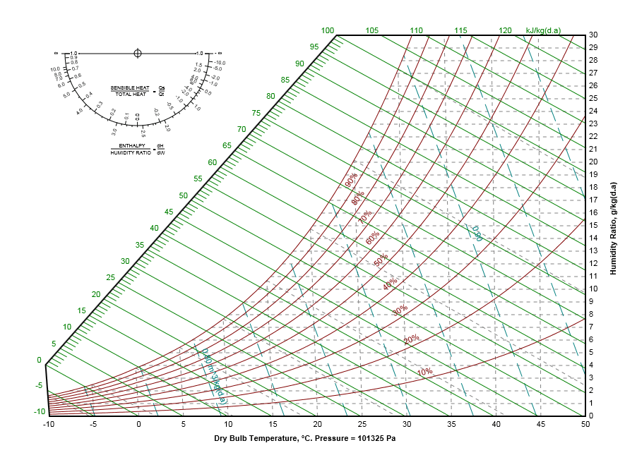 The psychrometric chart shows how the metrics evolve depending on your parameters. It shows the dry-bulb temperature (DBT), the absolute humidity, the relative humidity, and the enthalpy at a standard pressure: 101325 Pa. You can figure out any figure of the chart if you know 2 of these parameters.