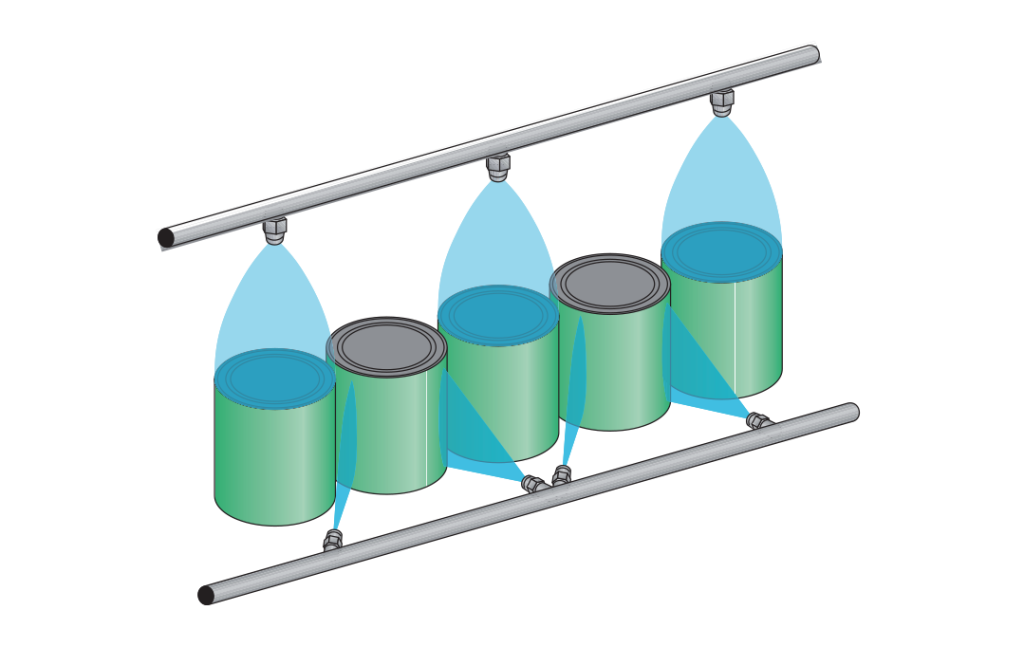 Complex-shaped objects, like cans, can be cleaned using a combination of conical spray nozzles and fan-shaped nozzles. Ikeuchi’s engineers can assist you in finding the most suitable combination of spray nozzles for your specific application. For this application, we recommend our VEP or JJXP nozzles.