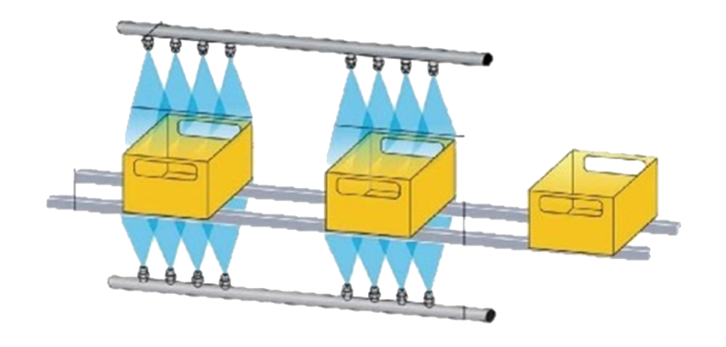 Boxes of all shapes can be powerfully cleaned with precisely placed nozzles. Ikeuchi’s engineers can advise you on the appropriate spray nozzle type and amount specifically needed for your application. For this application, we recommend our INQB or WUT nozzles.