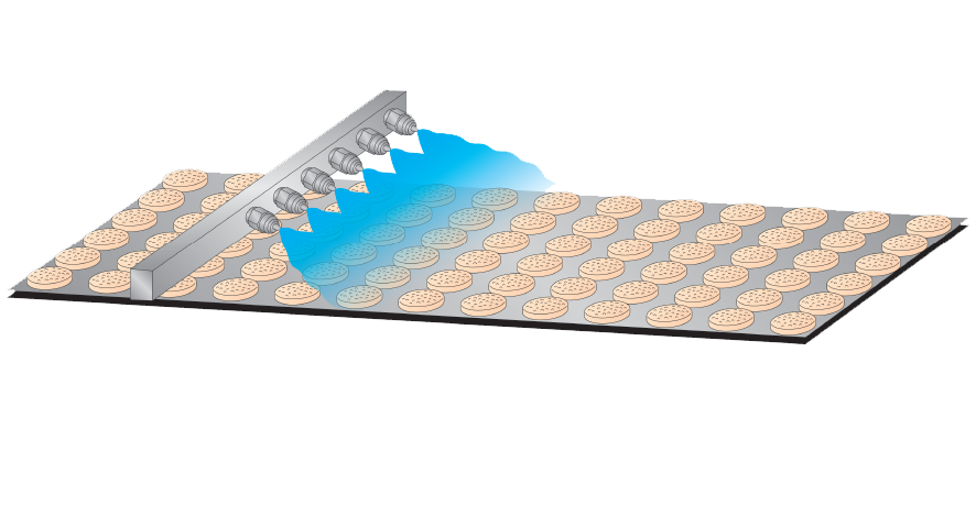 Moisturization of bread is important in every part of the process. Maintaining appropriate humidity levels helps preserve freshness and extend the shelf life of baked goods. To improve the texture after baking, a fine mist of less than 50µm can be added to control the humidity level and moisturization around the bread. Our BIM spraying system is ideal for this application as it has a fine atomization and can be installed on any conveyor belt.
