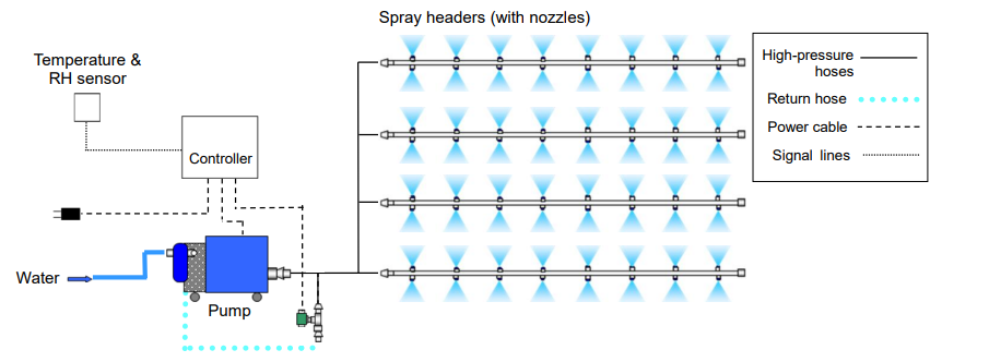 As can be seen below, the CoolPescon system consists of several spray headers with spray nozzles attached, a high pressure pump, a controller and a sensor.
