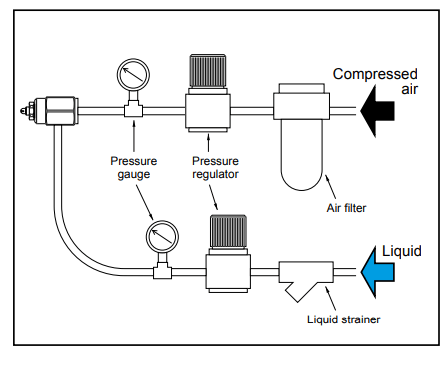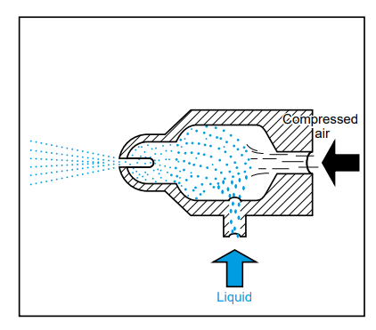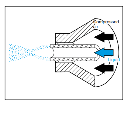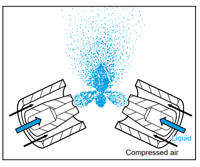 Compressed air and liquid are mixed outside the nozzle. Hence, this type clogs the least. This is also classified into inner air type and outer air type.
